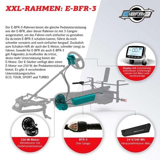 Der E-BFR-3-Rahmen bietet die gleiche Pedalunterstützung wie der E-BFR, aber dieser Rahmen ist mit 3 Gängen ausgestattet, um das Fahren noch einfacher zu gestalten. Da du beim E-BFR-3 schalten kannst, fährst du noch schneller vorwärts und noch einfacher bergauf. Zusätzlich zum Schalten hilft dir auch der E-Motor, schneller (weg) zu