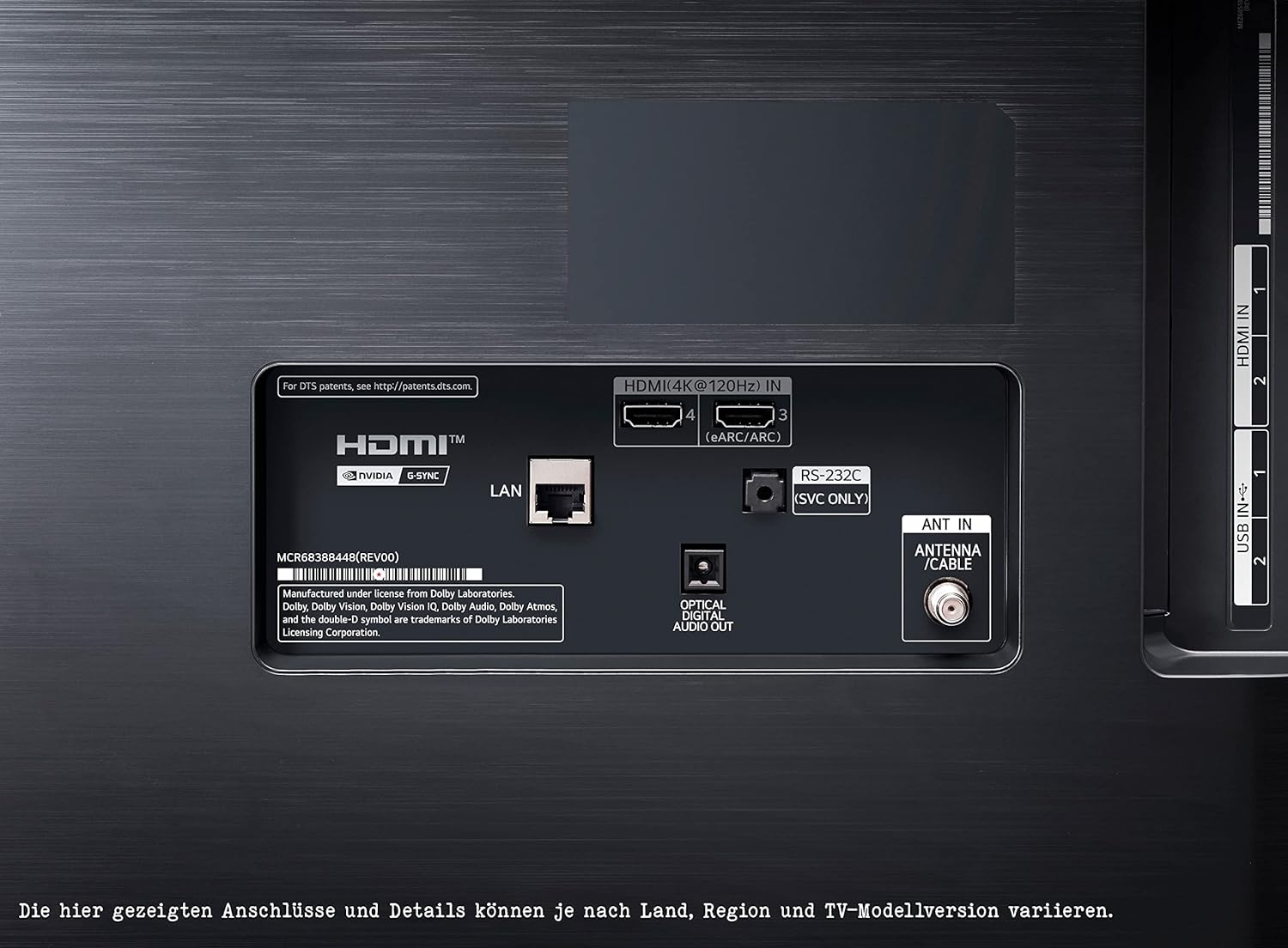 | Anschlüsse | 4x HDMI (4K 120Hz, eARC, VRR, ALLM, QMS (2 Ports)), 2x USB 2.0, 1x LAN (Ethernet), WiFi 5 (802.11ac), 1x LAN (Ethernet), Optischer Ausgang, CI+ Slot |